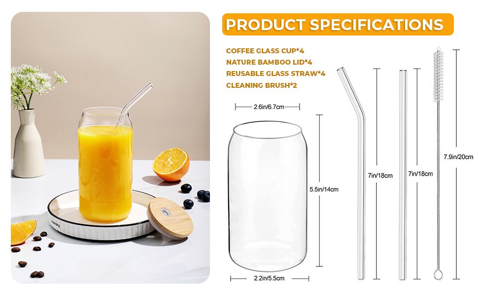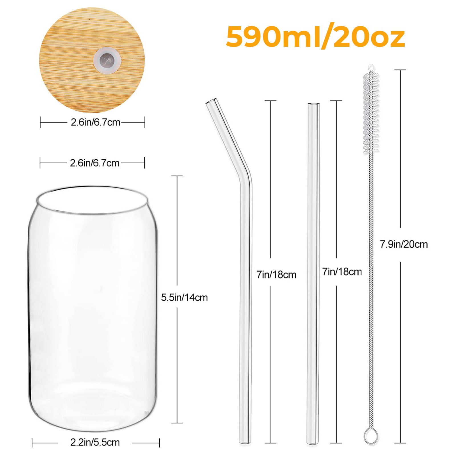 ✅Package Includes: Glass cups set includes 4 20oz glass coffee cups, 4 nature bamboo lids, 4 glass straws(2 straight straws & 2 bent straws), 2 cleaning brushes. Classic design, Very practical combination suit.