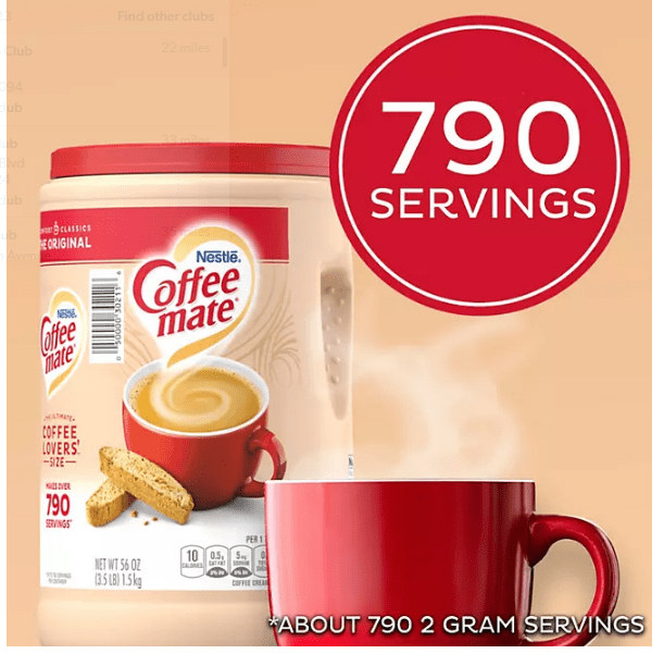 1.Net Content: 56.015 ounces Shelf Life of 360 days Pour or spoon Coffee mate into prepared coffee, tea, or cocoa. Stir and enjoy! One 56 oz. canister of Nestle Coffee mate Original Powdered Coffee Creamer