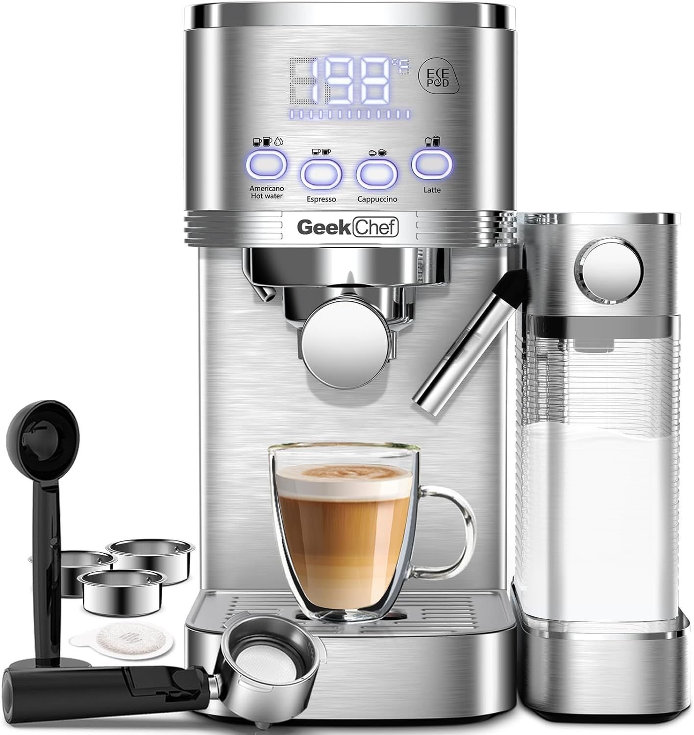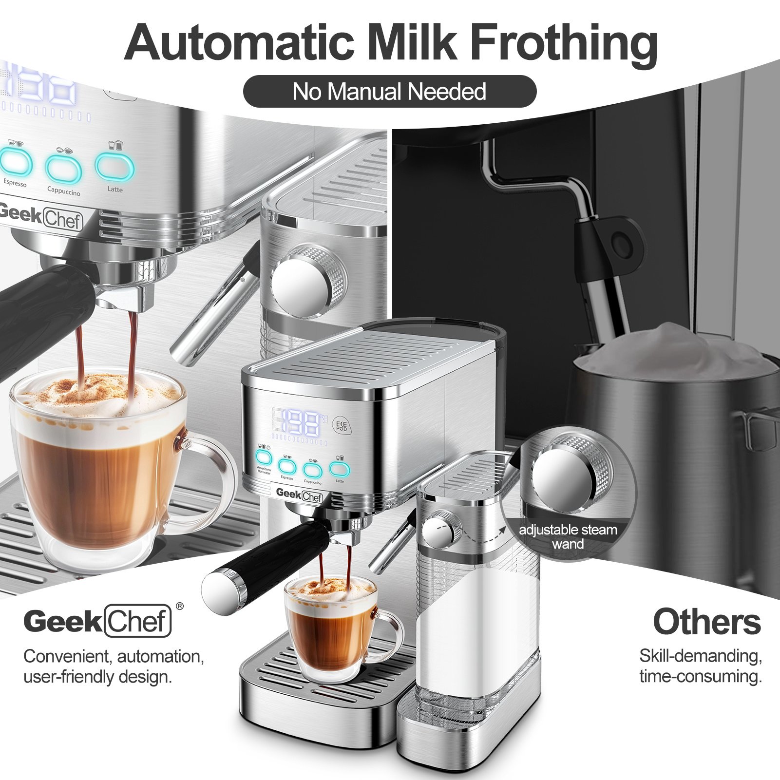 ☕All Your Favorite Coffees in One Machine - Geek Chef's coffee maker with automatic milk frother lets you brew americano, latte, cappuccino, or macchiato at home.Not only suitable for personal use, but also a perfect gift for others, such as wedding gifts, birthday gifts, Christmas gifts, Thanksgiving gifts, New Year gifts, and more.