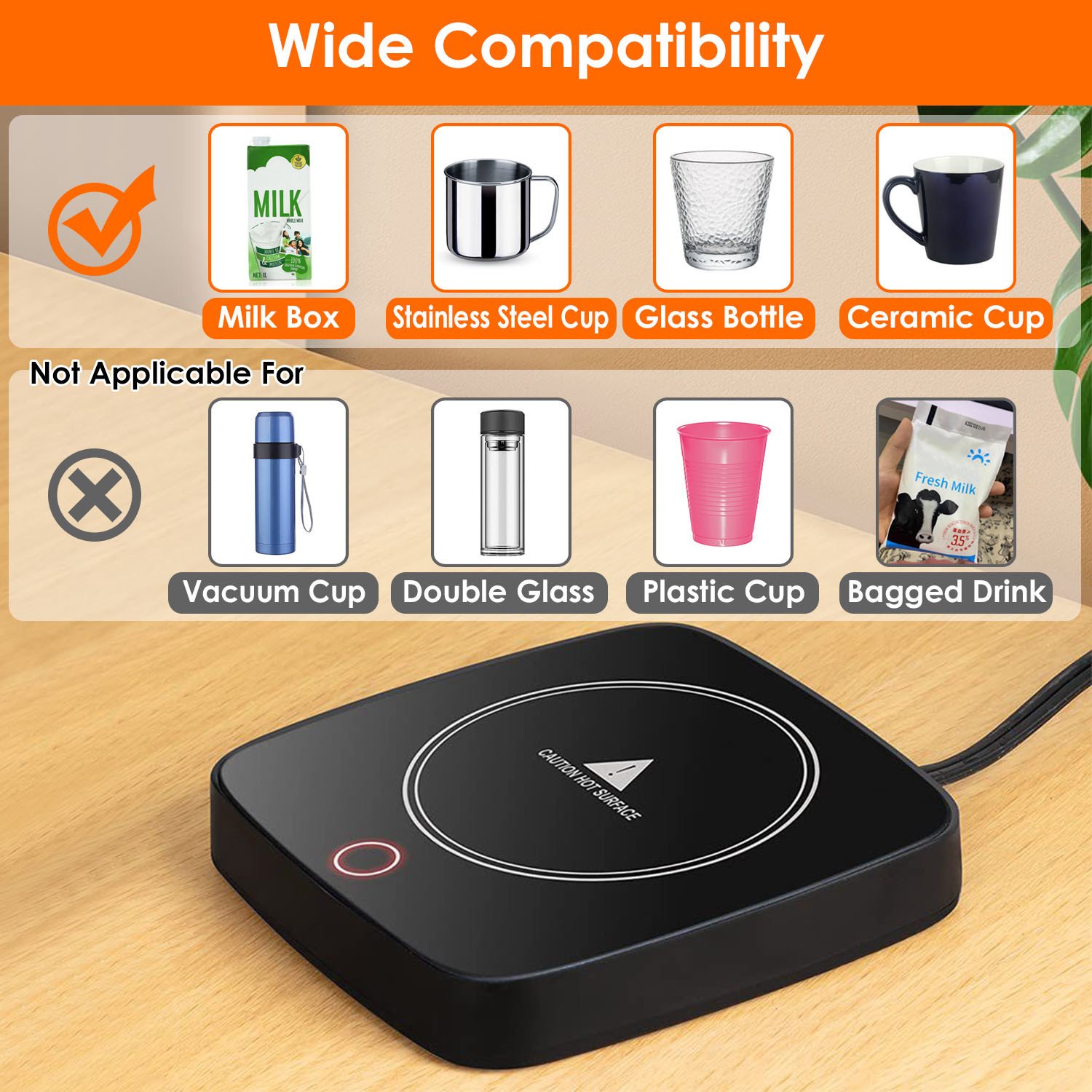 *Wide Compatibility*:With 3.14in diameter heating panel,this cup warmer is compatible with various types of cups,like glass bottle,stainless steel cup,ceramic cup. Made of sturdy and water-resistant ABS material,you can wipe the spilling liquid with soft cloth. And we recommend that the bottom of cup should be flat.