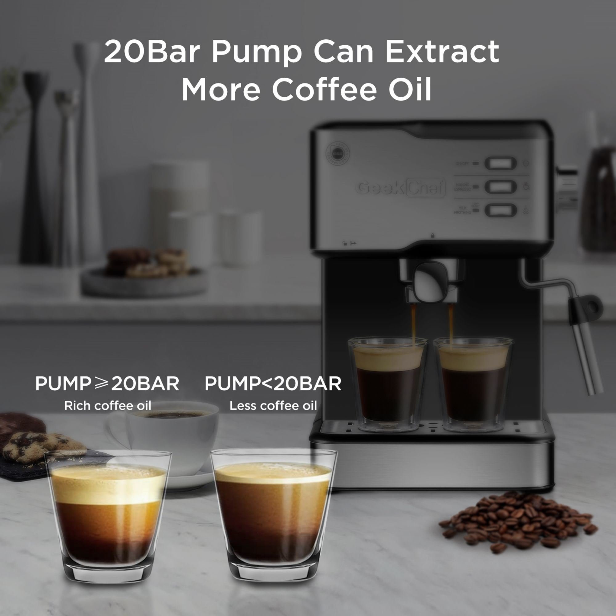 Introducing the Geek Chef Espresso Machine - your ultimate coffee companion for brewing exquisite espresso, cappuccinos, and lattes right in the comfort of your home or office. With its powerful 20 bar high-speed pump, this semi-automatic espresso machine guarantees a professional coffee-making experience, extracting every bit of flavor from your favorite coffee beans.