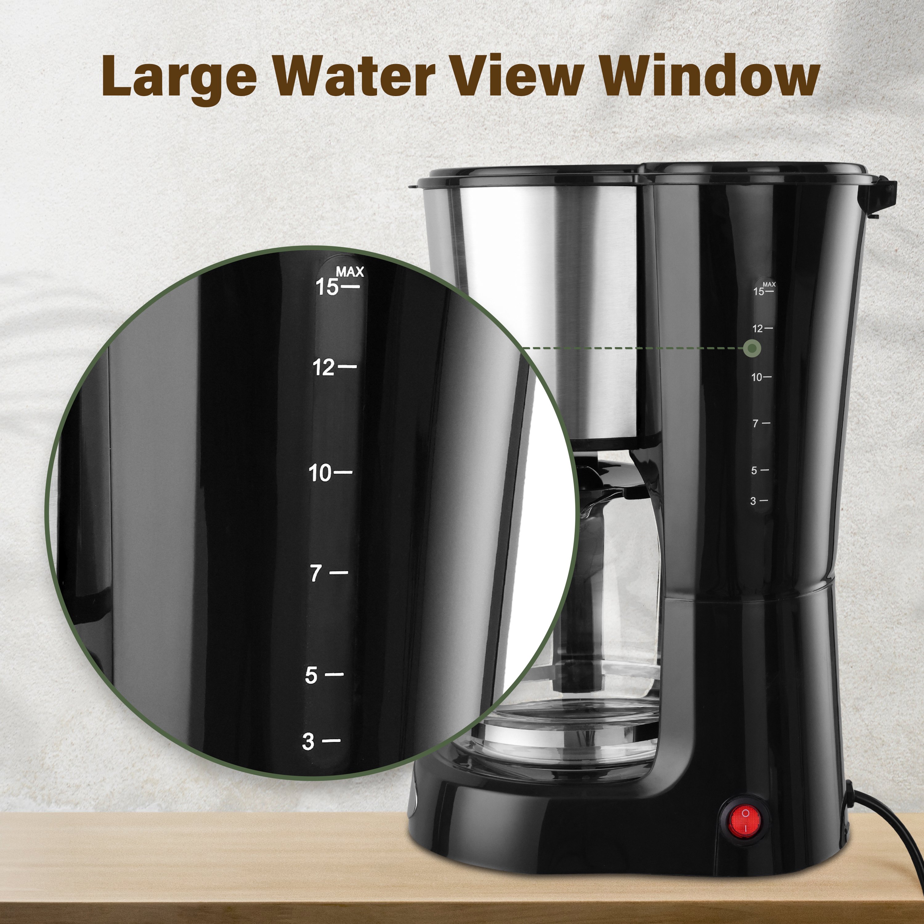 Easy view: The clear water level window enables you to gauge and keep track of whether the tank has the necessary amount of water before starting the brewing process.