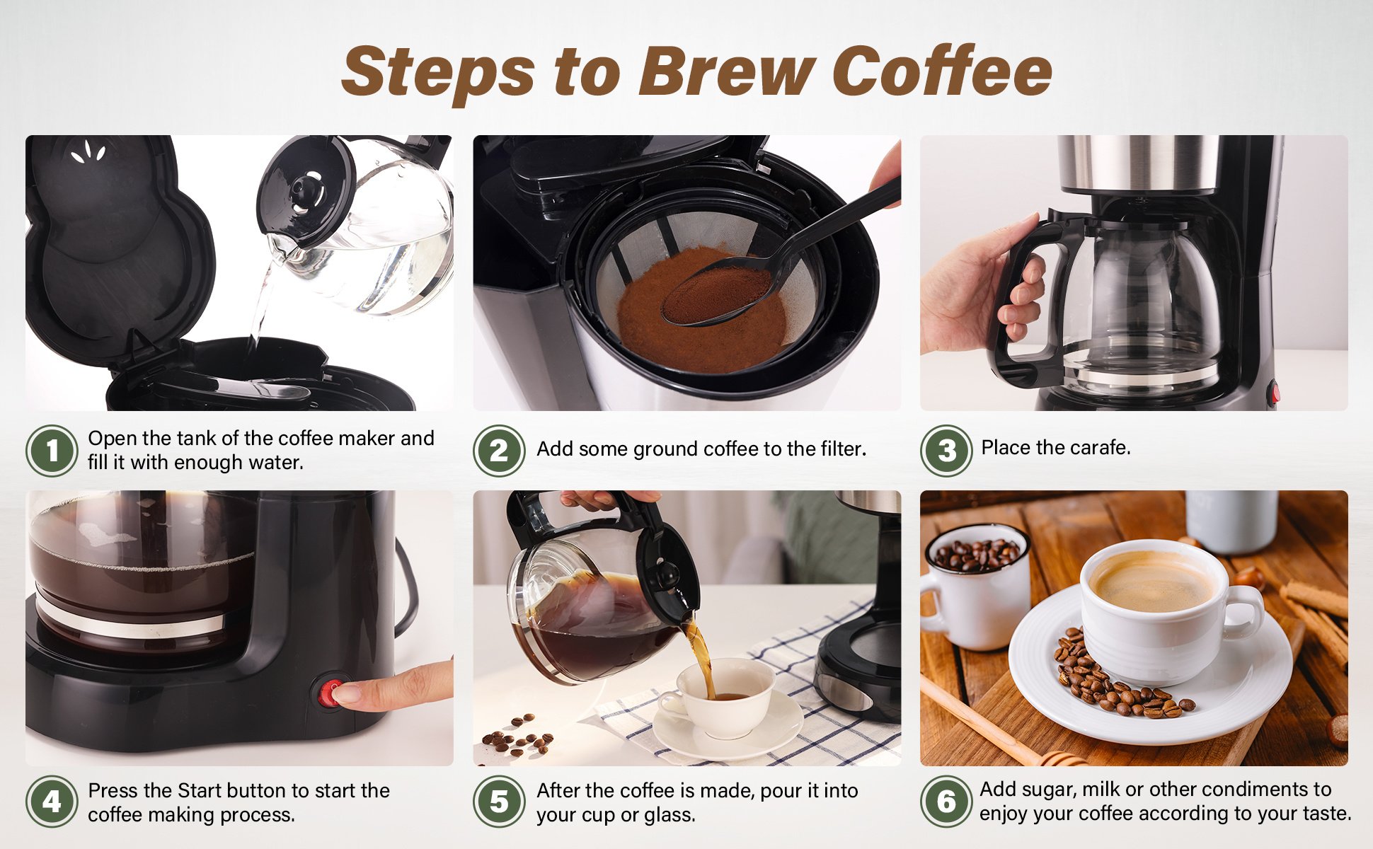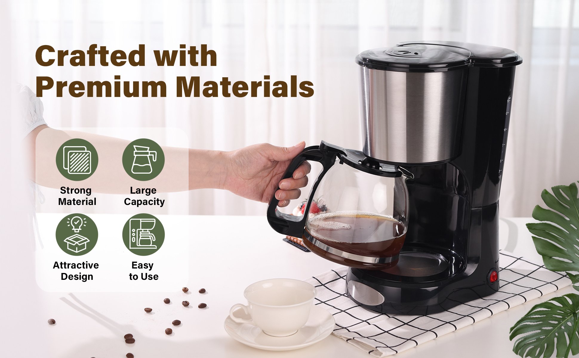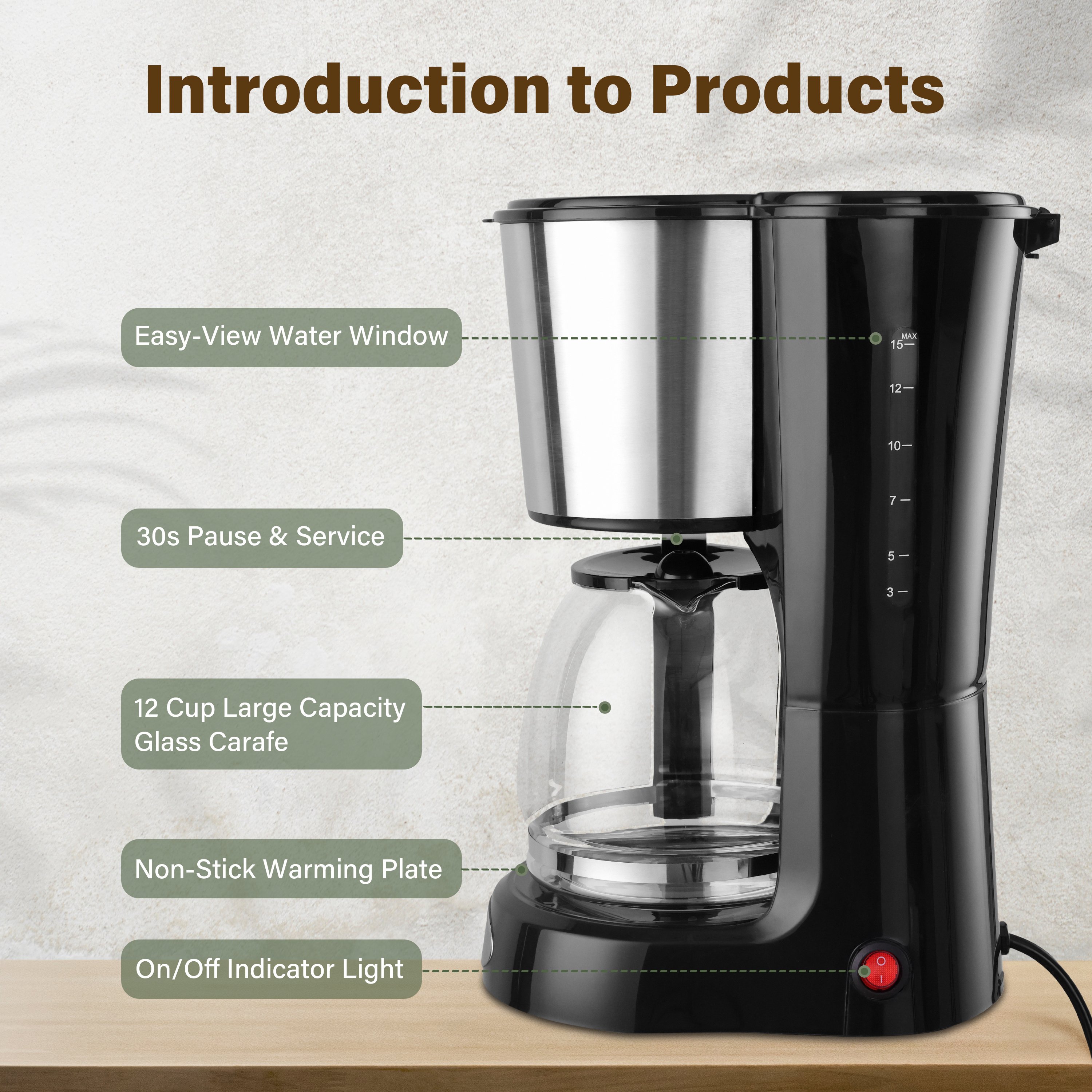 Perfect Size with Large Capacity: the 12-cup drip coffee maker with its compact design is suitable for use in the home, office, and apartment.