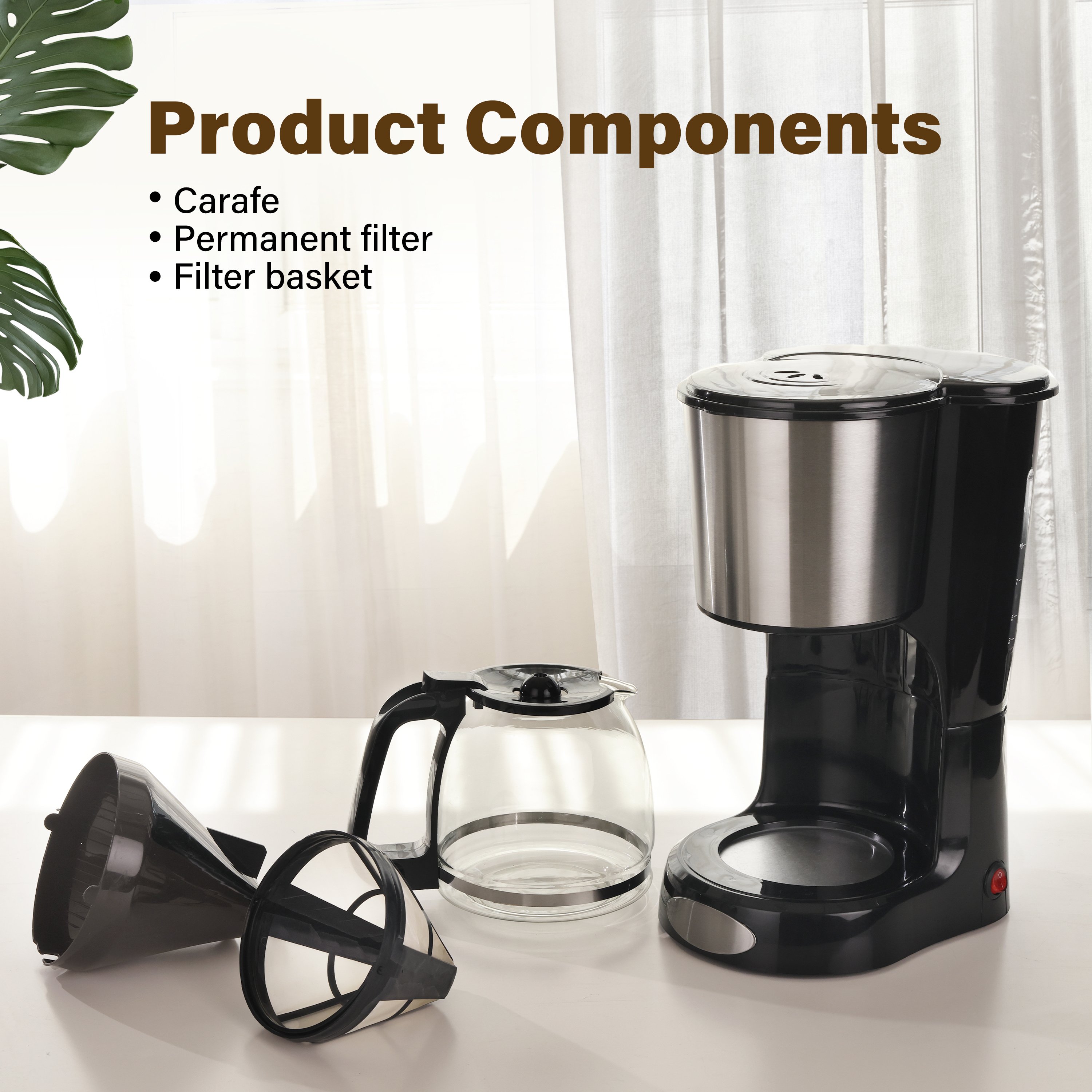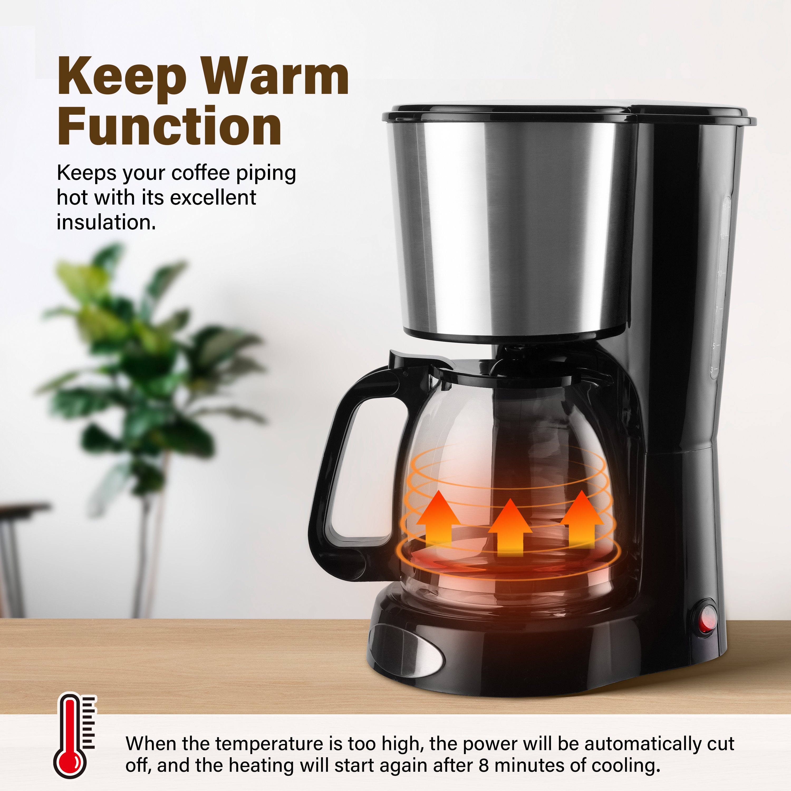 Keep warm function: This coffee pot is equipped with a metal carafe plate to keep the coffee warm after brewing, which helps preserve its taste and aroma for an extended period.