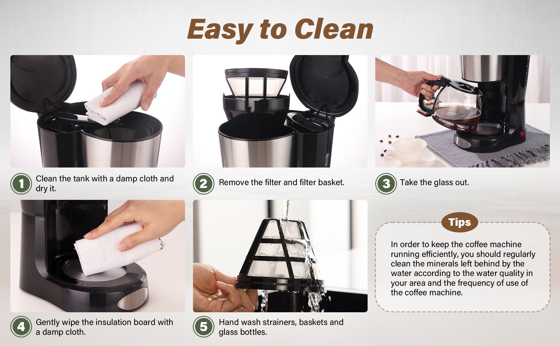 Easy to Clean: Apart from its stainless-steel housing, the coffee machine's anti-drip feature and removable filter design contribute to easy cleaning without any hassle.